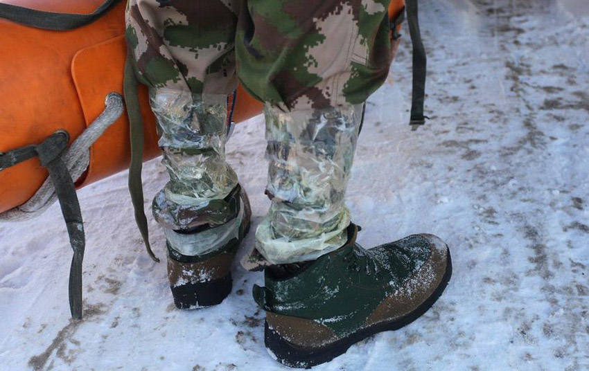 12月23日,搜救队员脚上绑上透明胶,防止弄湿裤子。
