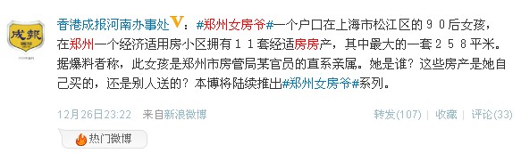 12月26日晚11时22分,新浪微博上实名认证为“香港成报河南办事处主任、河南分社(筹)社长”的网友@香港成报河南办事处发微博称: