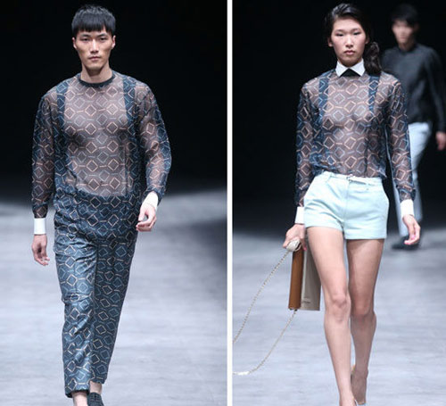 【摘要】2013春夏中国时装周的T台上最HIT的潮流装扮必定非真空透视装莫属,用各位设计师的话来讲,就是在经济萧条时期,更需要透视装来吸引人眼球。于是,在各大秀场上,均可看到透视元素的运用,而情侣透视装更是抢尽眼球,男模必须秀出肌肉,女模必须隐露凸点。