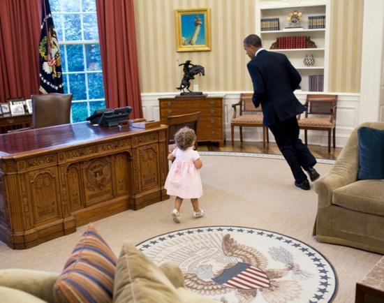 奥巴马与白宫职员的小女儿绕圈追逐,玩得十分开心。