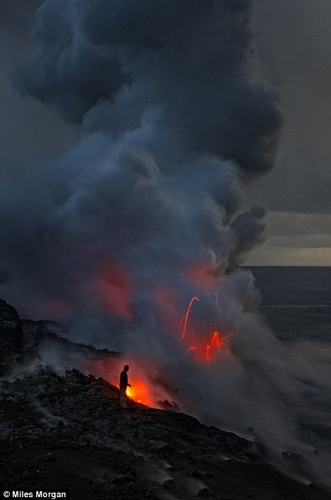 美国摄影师迈尔斯·摩根为拍摄理想照片,冒生命危险攀登上夏威夷活火山。