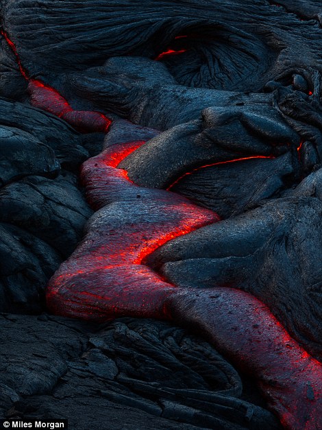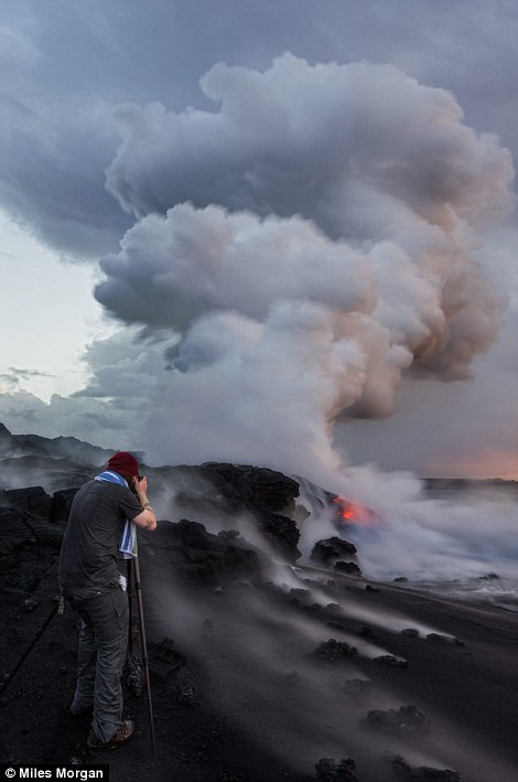 美国摄影师迈尔斯·摩根为拍摄理想照片,冒生命危险攀登上夏威夷活火山。