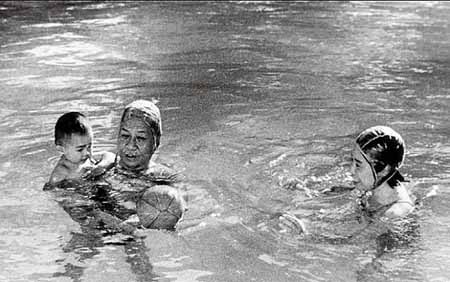 刘少奇和王光美(怀抱为小小)在北戴河海滨。