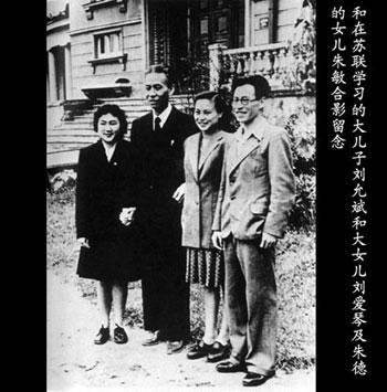 图为1949年8月,刘少奇在莫斯科同刘允斌、刘爱琴及朱德的女儿朱敏合影